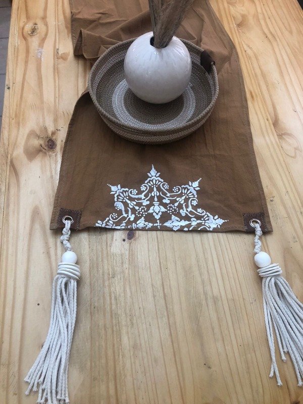 Camino en tussor estampado en pasta puf con borlas de porcelana